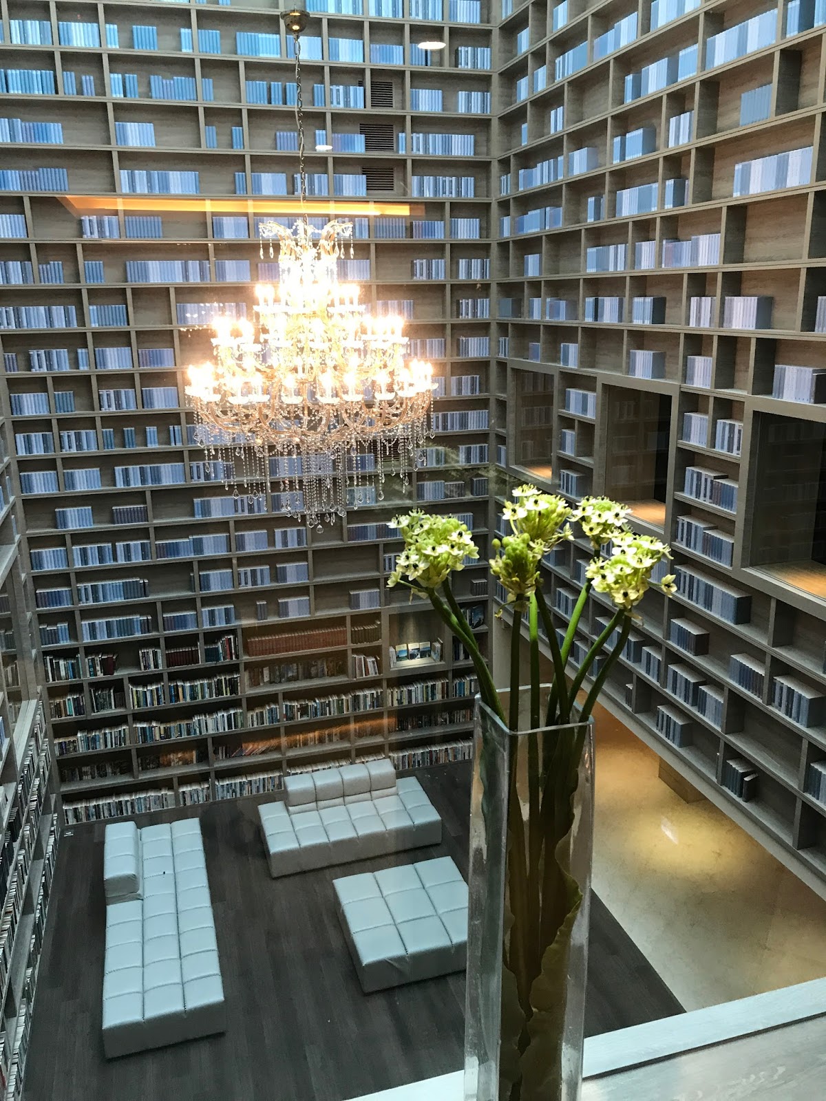大廳挑高四層樓的光陰部落藏書閣,收集了世界各國將近五千冊的二手書籍。藏書閣運用純白色系及原木質感,上方設置大面天窗引入自然的光線,讓室內空間隨著日夜交替而有不同的光影變化,也呈現出極簡時尚風格。旁邊的每扇窗戶,因高低左右皆不同的位置,往藏書閣方向看過去的景色亦不盡相同,稱為「一窗一景」。